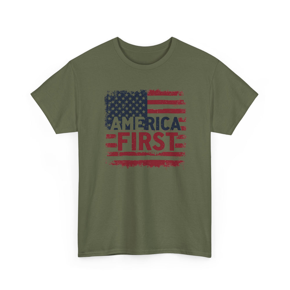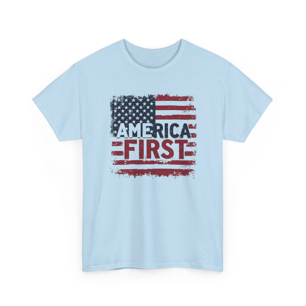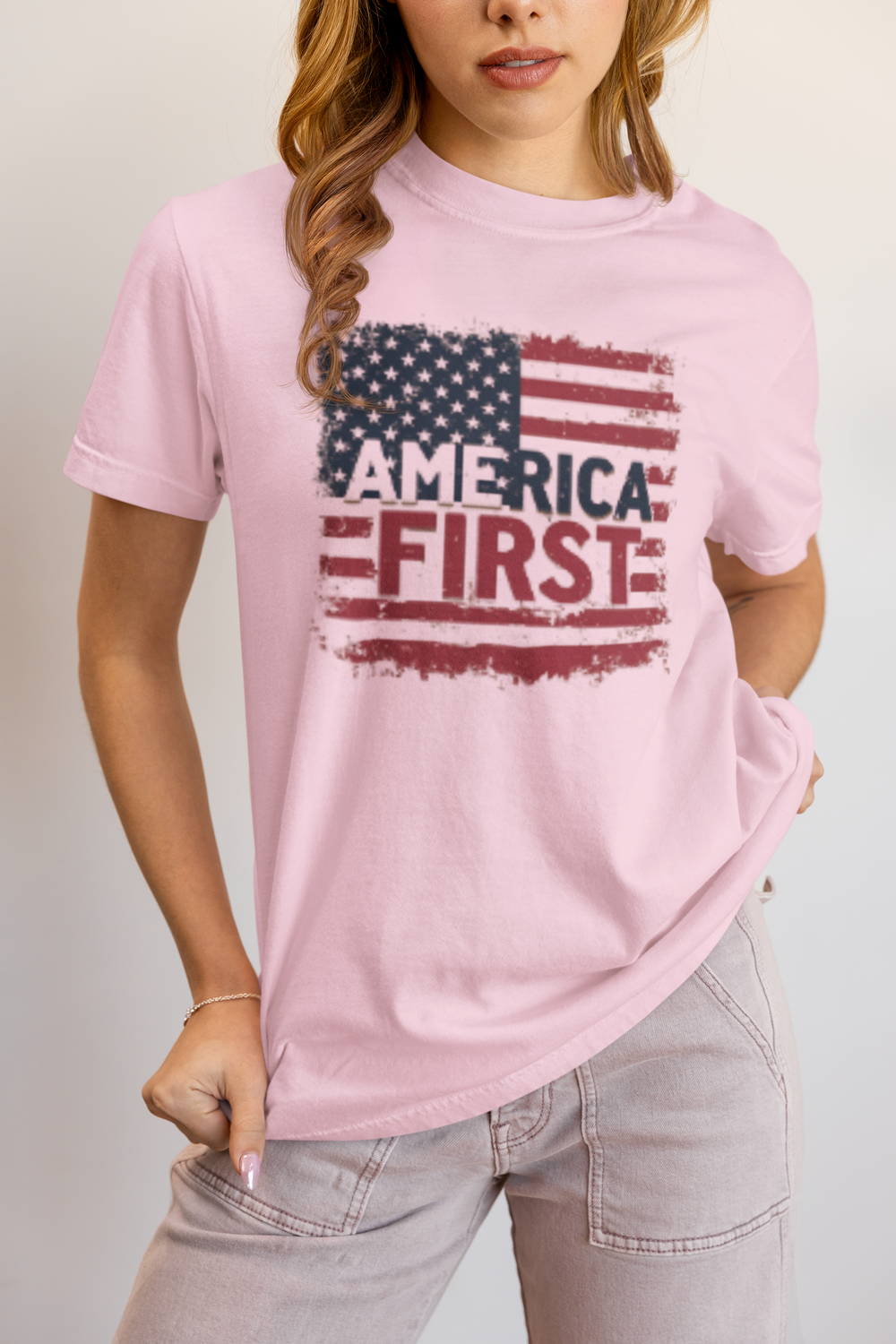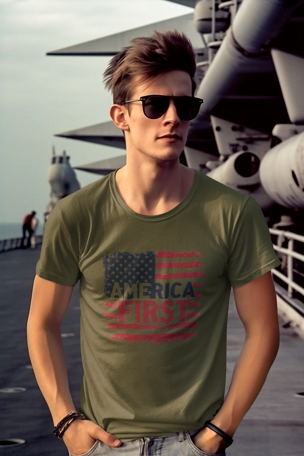 Show your patriotism with the bold America First T-Shirt. Featuring a distressed American flag design, this tee is perfect for those who believe in standing strong for freedom, values, and putting America first.