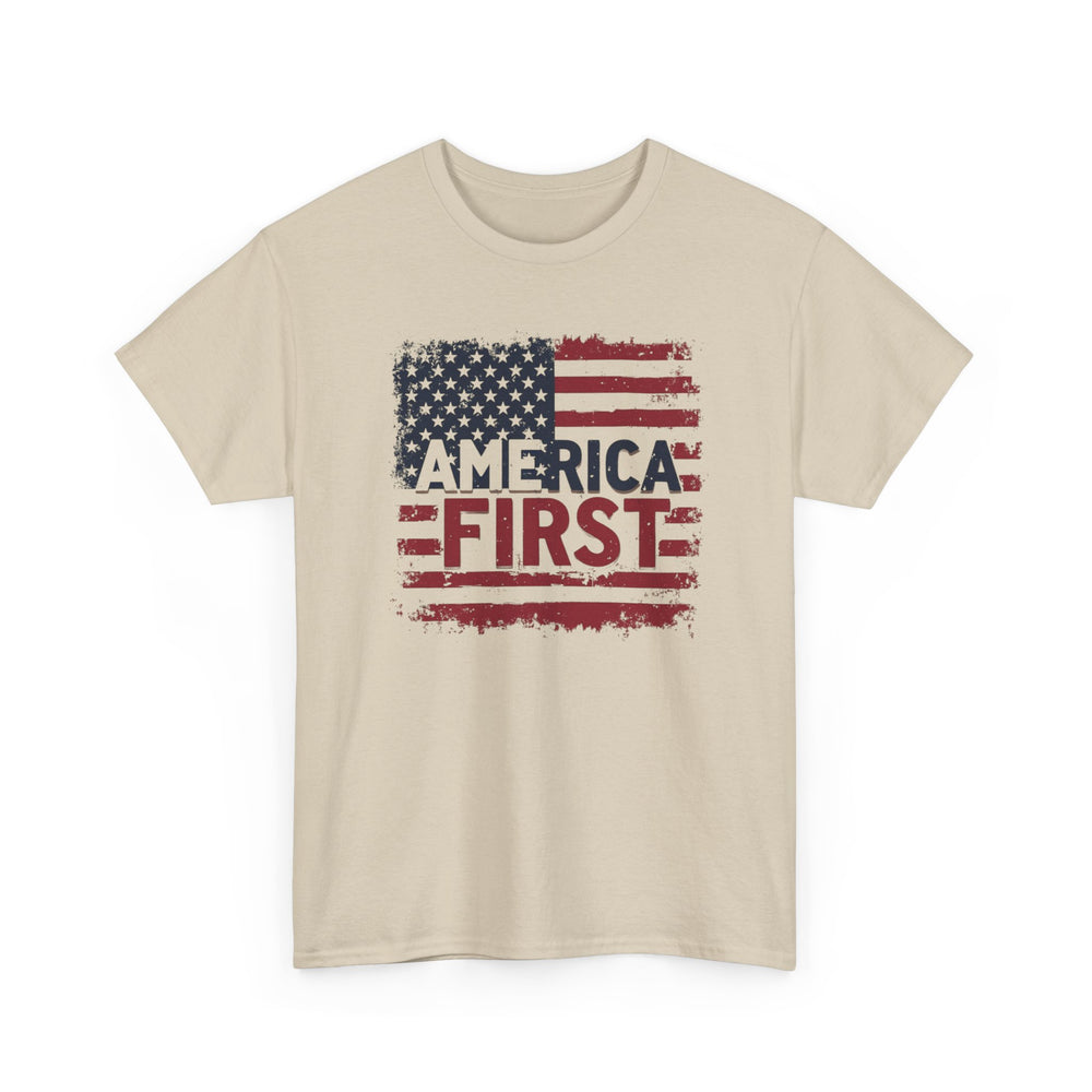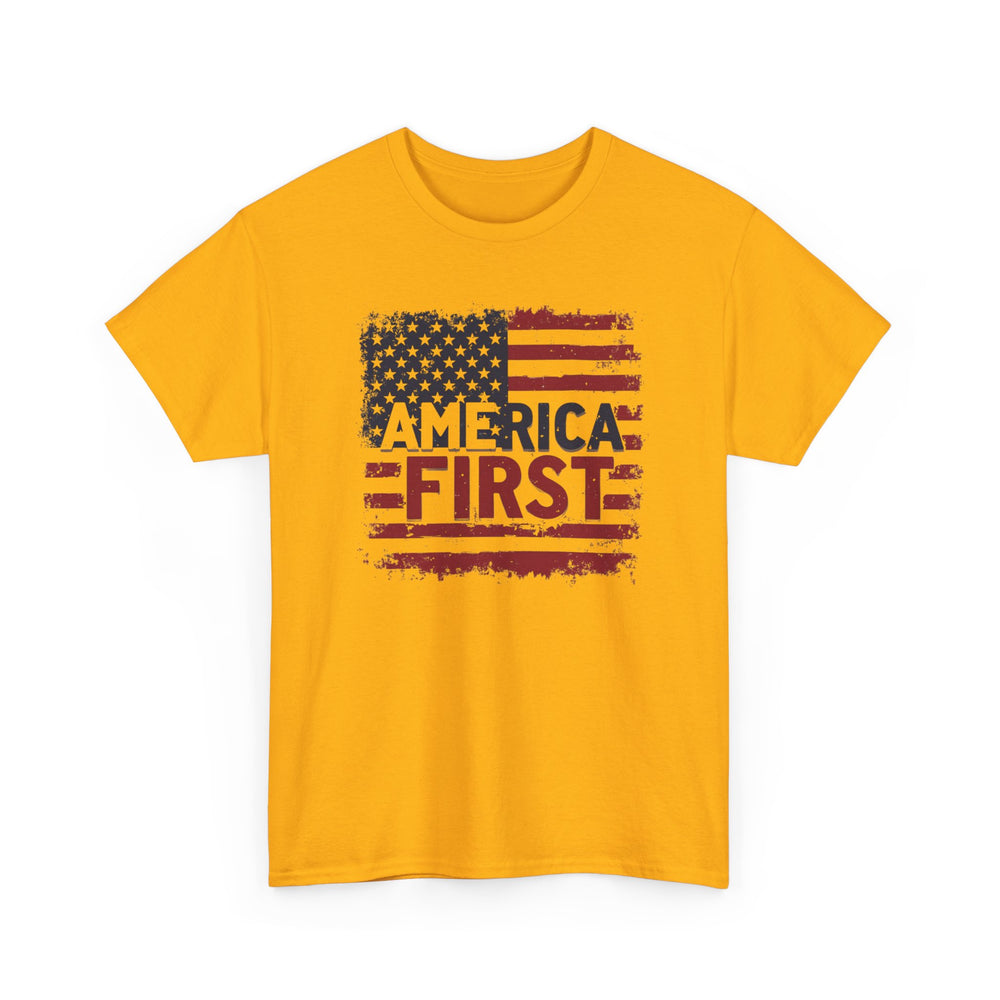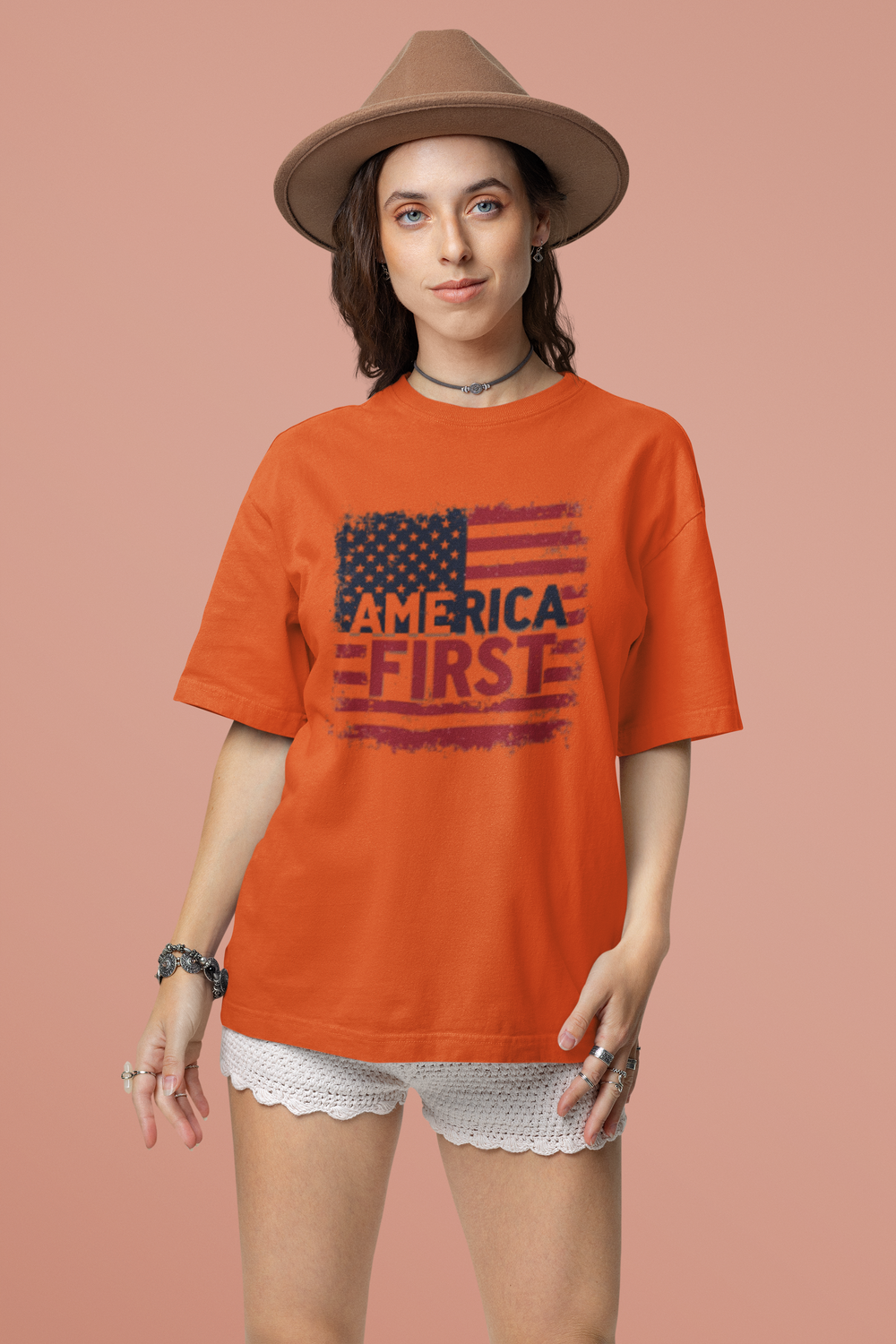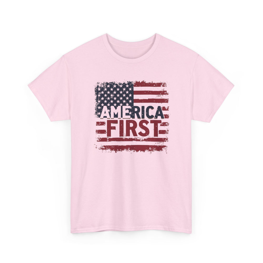 Show your patriotism with the bold America First T-Shirt. Featuring a distressed American flag design, this tee is perfect for those who believe in standing strong for freedom, values, and putting America first.